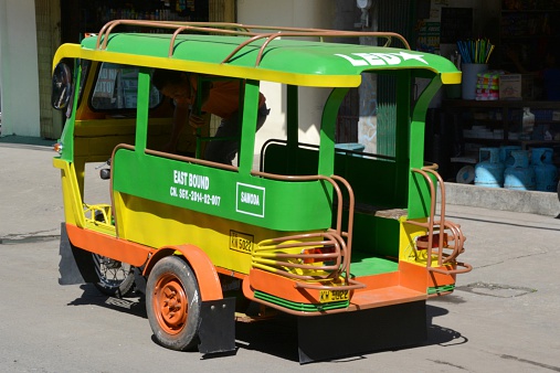 Mambajao, Philippines – February 6, 2014: Local Tuk Tuk parked on the streets of Mambajao village, Camiguin’s largest municipality.